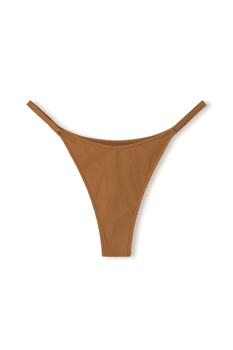 The Almond Rib Curve Thong by Zulu & Zephyr offers a softly curved waistline, thin rouleau sides, and a flattering high-cut leg with skimpy rear coverage. Pair with the Almond Rib Bralette for a minimal set.