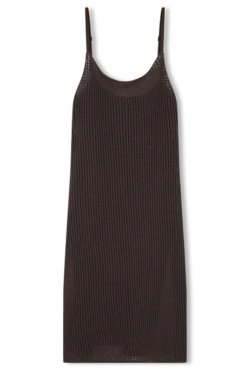 The Charcoal Cotton Crochet Dress by Zulu & Zephyr is a tactile sensation, featuring a midi length, keyhole back detail with branded button closure, sturdy slim adjustable straps, and side splits reaching around mid-thigh, in an unlined dark grey custom crochet offering a summery semi-sheer appearance. Layer this essential piece over the coordinating Charcoal Cotton Crochet Pant, or wear alone over swim.