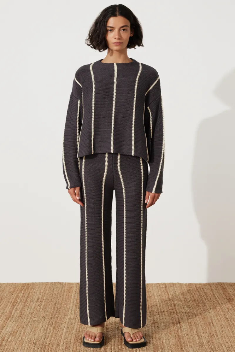 The Charcoal Stripe Knit Pant by Zulu & Zephyr is a versatile wardrobe staple crafted for year-round wear. Made from a luxurious weighted cotton knit, featuring a soft elasticated waistband in a high waist straight leg fit. The classic contrast knit stripe is best paired with the Charcoal Stripe Knit Jumper for a coordinated look.