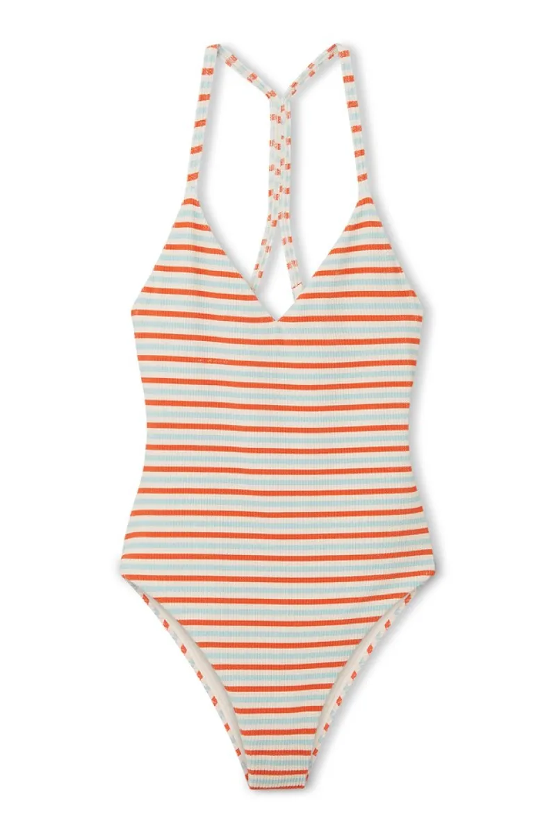 The Chilli Stripe Textured One Piece by Zulu & Zephyr is an athletic-shaped One Piece featuring a flattering V neckline, fixed straps and fine racer back detailing with an open back cut out. This One Piece is constructed from our classic textured rib swim fabric in a vibrant chilli and baby blue stripe. Pair with Denim shorts to take you from the beach to lunch.