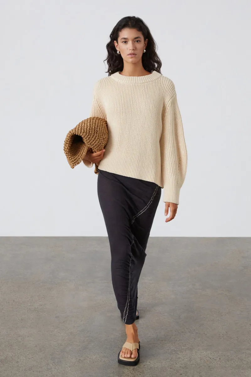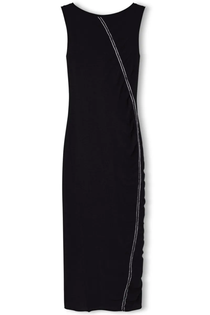 The Contrast Knit Dress by Zulu & Zephyr showcases a sleek high neckline and a curved front seam with contrast trim, creating a striking silhouette. Falling to a mid-maxi length, this timeless black dress is designed for versatility, making it an ideal choice this resort season.