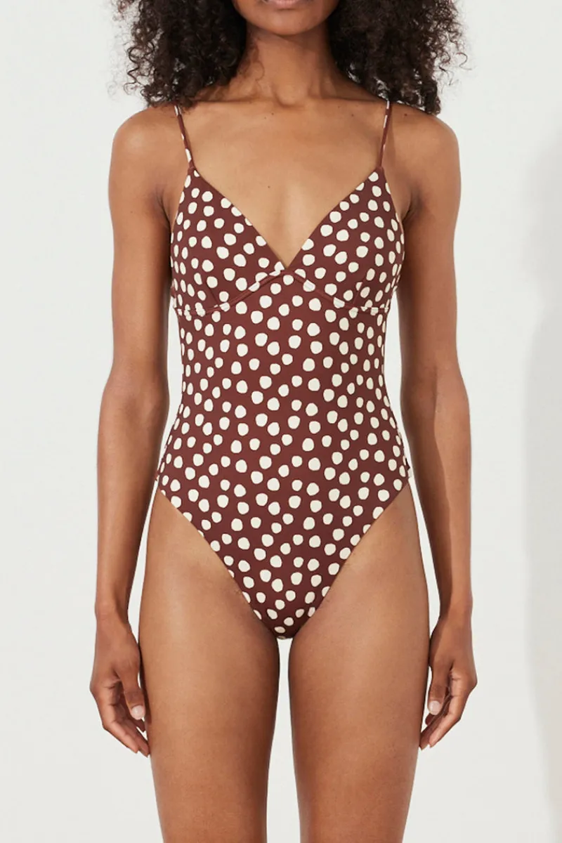 The Currant Spot One Piece by Zulu & Zephyr features a low scoop back, high cut leg, and a soft bust without underwire in a custom hand-painted print. The adjustable thin shoulder straps feed through to the back, where they may be tied to suit, offering an optimum fit.