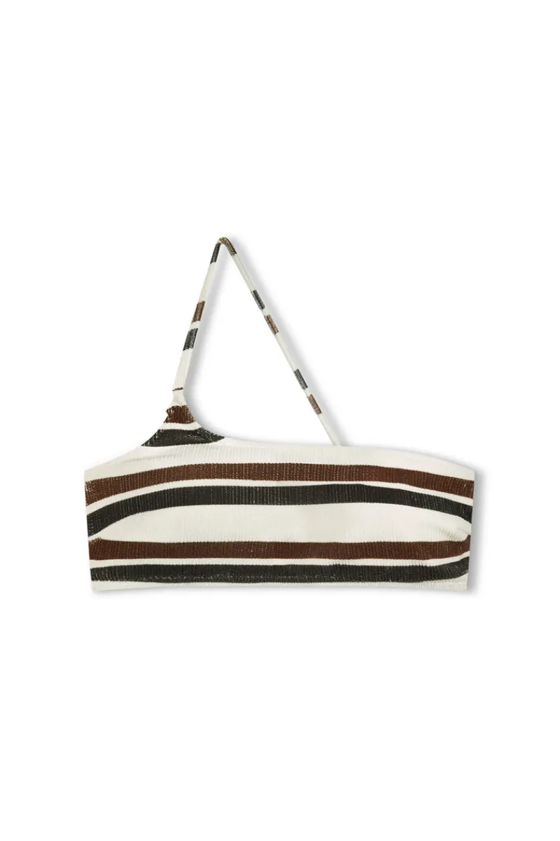 The Earth Stripe Textured Bralette by Zulu & Zephyr features a vintage wash crinkle stripe print in a one-shouldered slim fitting silhouette. With a comfortable soft unpadded bust and adjustable shoulder strap. Pair with the Earth Stripe Textured Curve Brief to complete the bikini set.