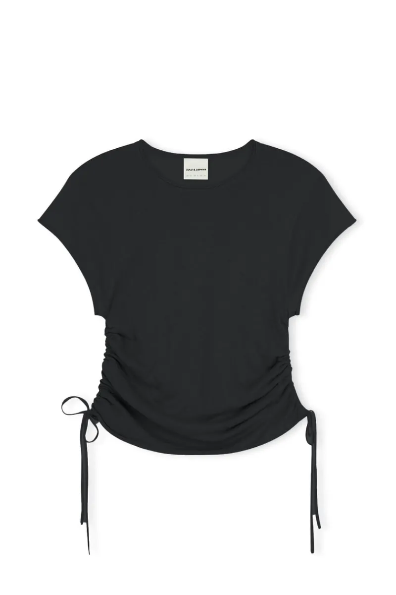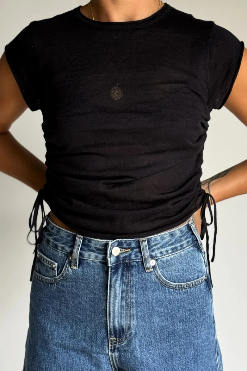 The Gathered Knit T-Shirt – Black by Zulu & Zephyr is a soft, semi-sheer elevated basic. It features a high neckline, clean-finish sleeves, and functional drawcord side seams. This versatile piece is best paired with everyday styles like the Mid Rise Recycled Denim Jean.