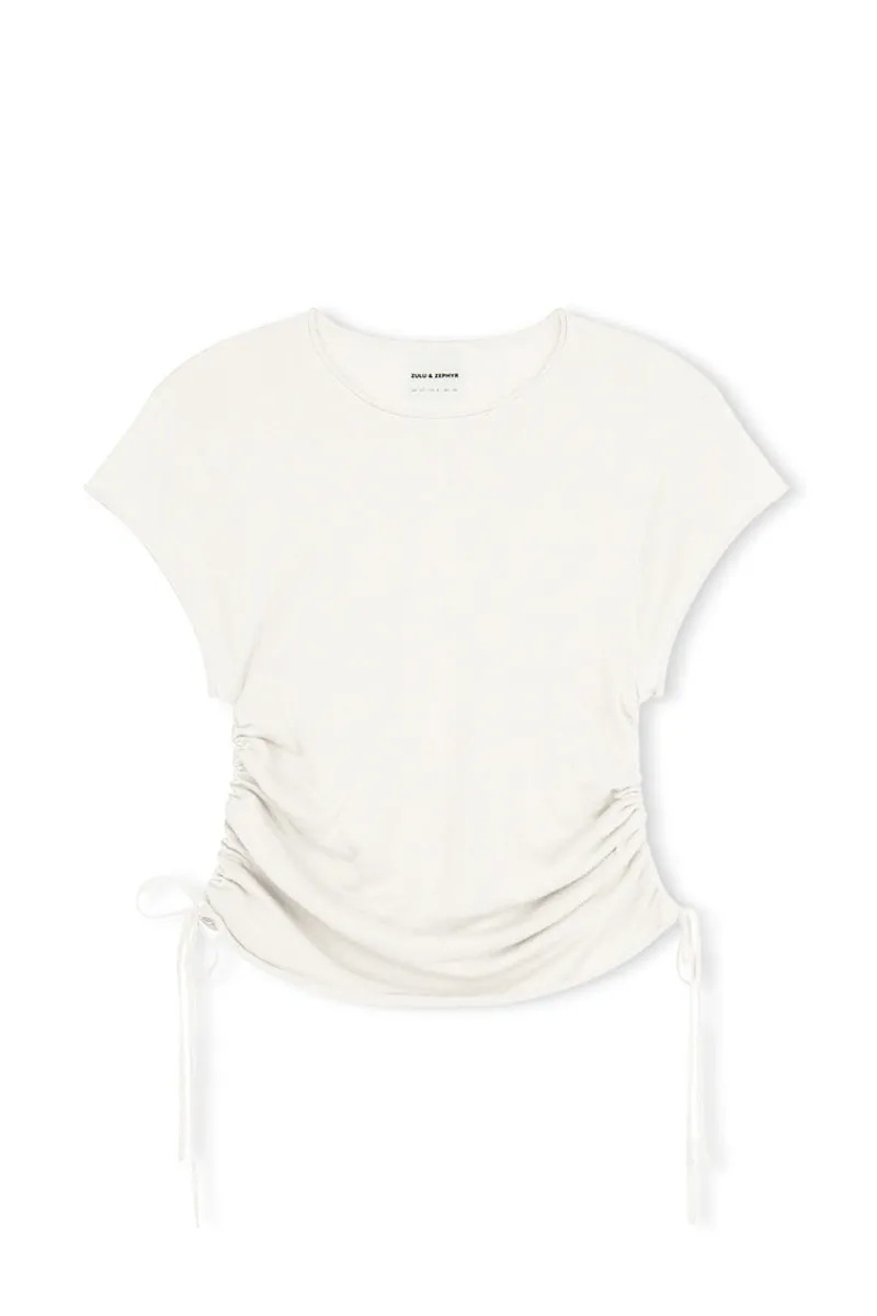 The Gathered Knit T-Shirt – White by Zulu & Zephyr is a soft, semi-sheer elevated basic. It features a high neckline, clean-finish sleeves, and functional drawcord side seams. This versatile piece is best paired with everyday styles like the Mid Rise Recycled Denim Jean.
