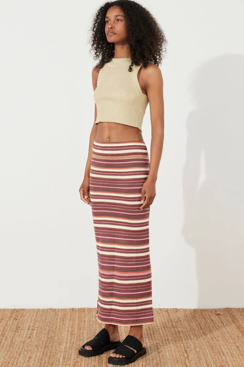 The Golden Retro Stripe Knit Skirt by Zulu & Zephyr features a slender flat elasticated waistband, and maxi length with a fitted silhouette, in lightweight cotton. The Stripe Knit Skirt is perfect for transeasonal or occasional dressing. Pair under the Golden Retro Stripe Knit Dress for a layered look.