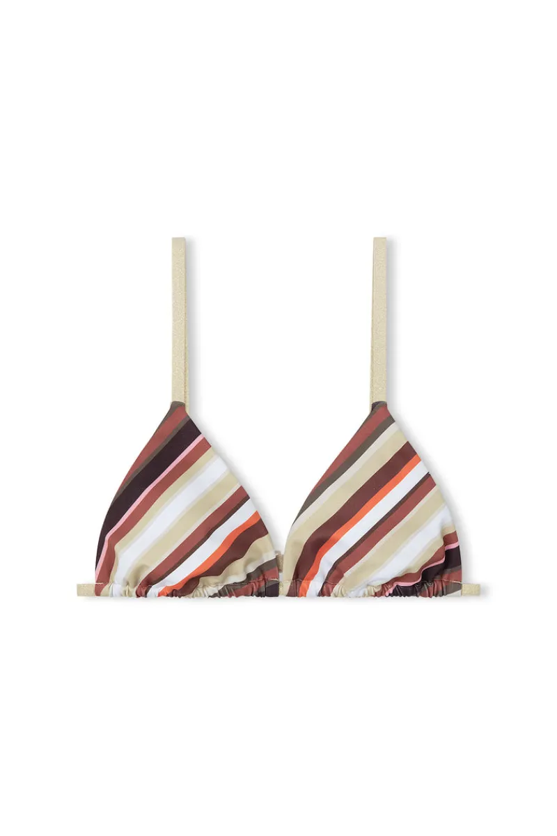 The Golden Retro Stripe Triangle by Zulu & Zephyr is a minimal shaped Tri featuring a soft bust without padding, and adjustable golden shoulder straps, in a brushed custom printed stripe fabrication with a soft luxe feel. Pair with the coordinating Golden Retro Stripe Curve Brief to complete the set.