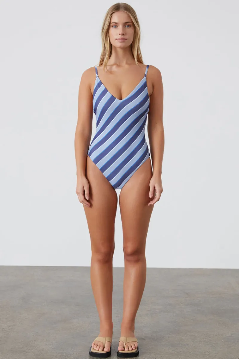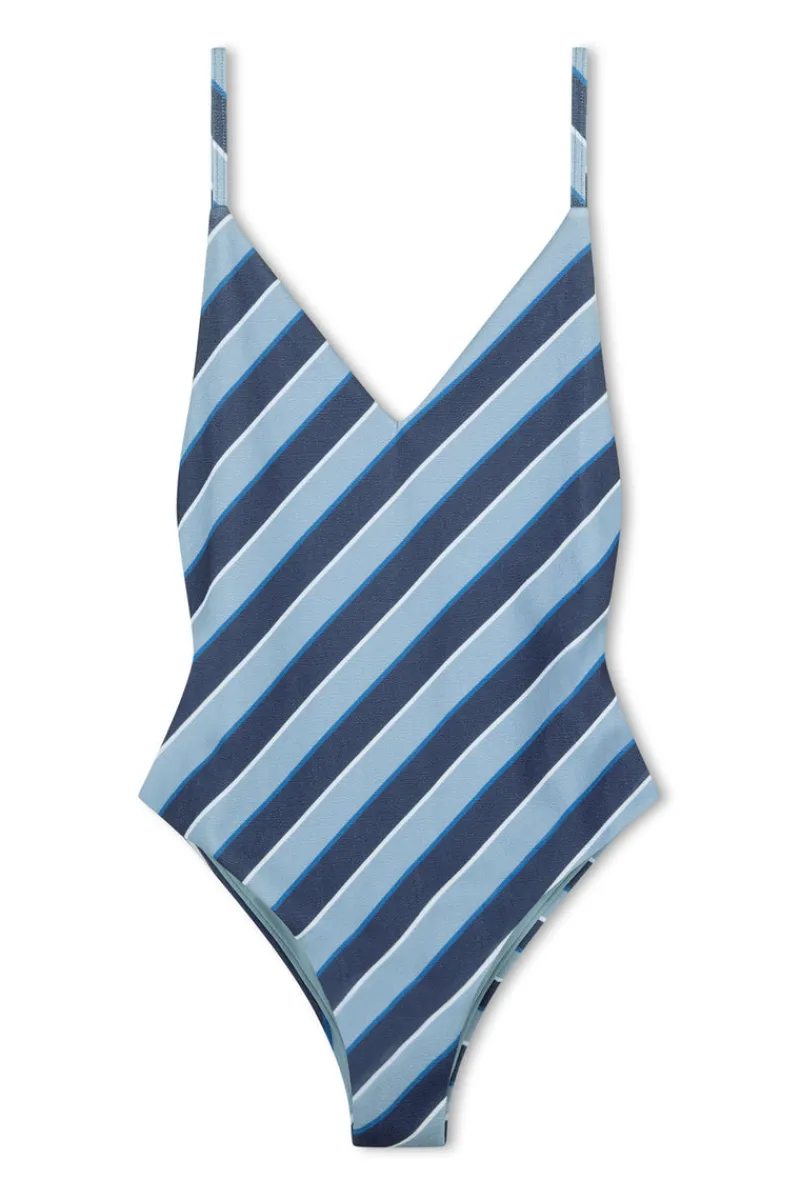 The Horizon Stripe Textured One Piece by Zulu & Zephyr features a custom stripe print in a textured fabric for added dimension. Designed with a flattering V neckline and adjustable straps for a tailored fit, it also boasts a low back detail for a sleek silhouette – this piece combines style and sustainability.