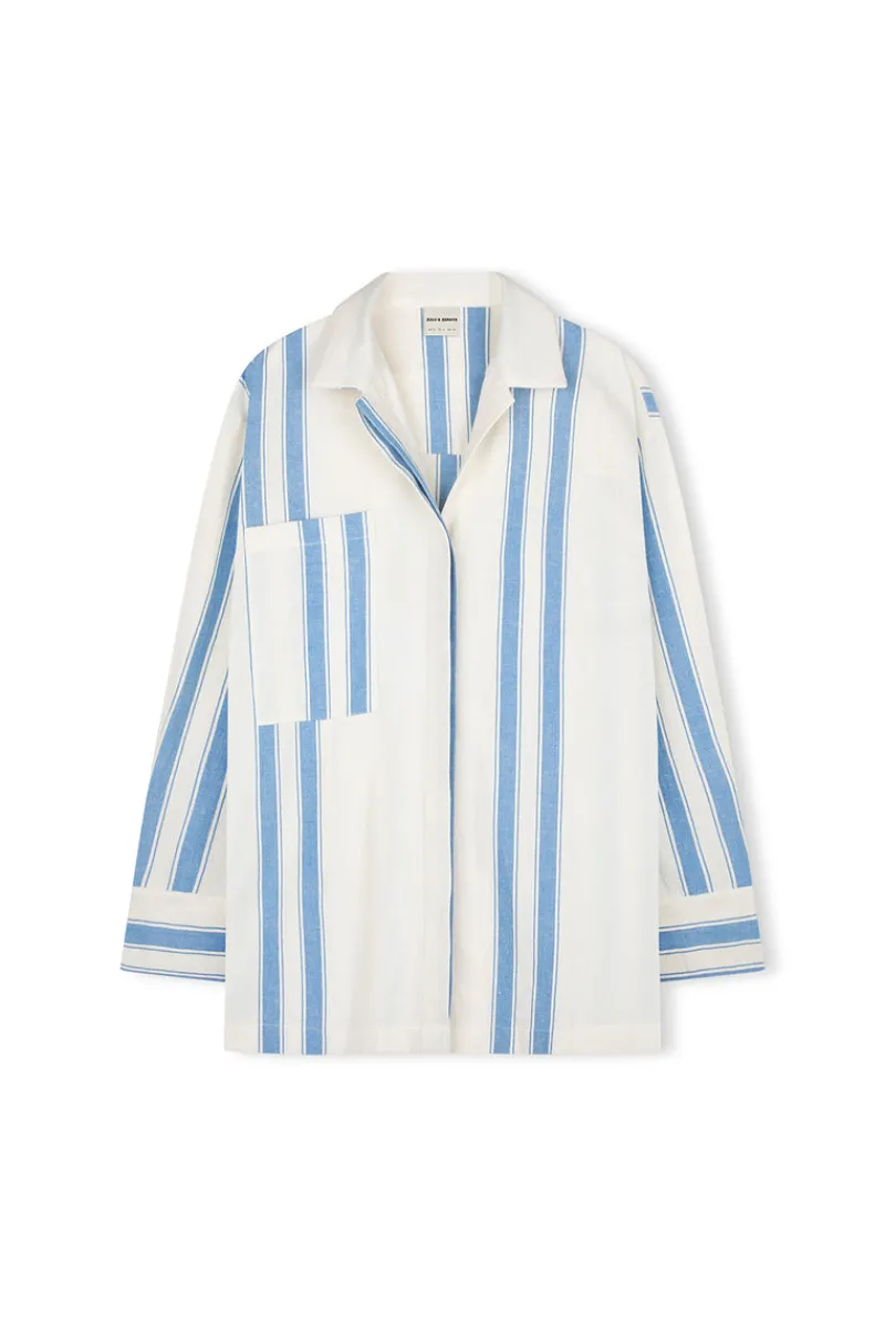 The Marine Stripe Organic Cotton Blend Shirt by Zulu & Zephyr features a custom blue stripe on a classic cream base. Designed with a traditional cuff and concealed placket, this timeless shirt offers a refined yet casual look. Perfect for layering over swimwear or pairing with denim, it’s a versatile staple for any wardrobe. Style with Marine Stripe Organic Cotton Blend Mini Skirt for a coordinated look.