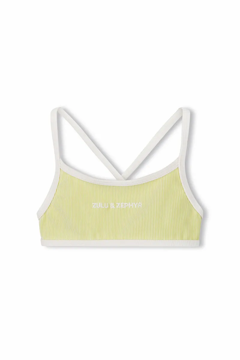 The Mini Stripe Rib Logo Bikini Top by Zulu & Zephyr is designed in a soft, two-tone ribbed fabric, perfect for stylish little swimmers. This retro-inspired crop top features contrast ribbed white trim, thin cross-over straps for a secure fit, and is finished with the signature Zulu & Zephyr logo. Pair with your preferred Mini swim bottom to complete the set.