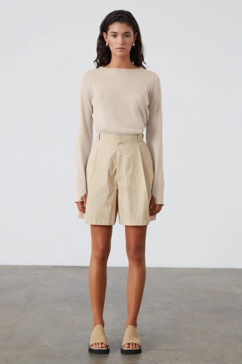 The Natural Organic Cotton Short by Zulu & Zephyr is crafted from lightweight organic cotton with a crisp texture. It boasts a high-rise silhouette with a fixed waistband, front zipper fly, and an elasticated back for extra comfort. With functional side pockets and a pleated front, these shorts offer both style and practicality.