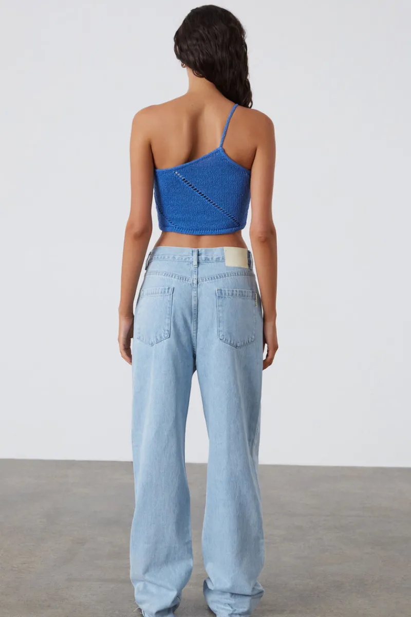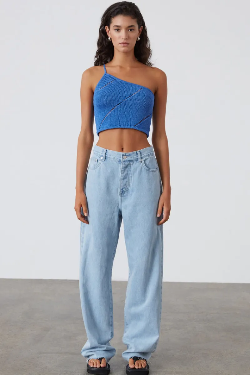 The Ocean Blue Lattice Knit Top by Zulu & Zephyr features an elegant one-shoulder design and waist-length fit. Crafted from a soft, luxurious knit, this summery top is highlighted by intricate diagonal lattice detailing, making it a perfect addition to your resort wardrobe.