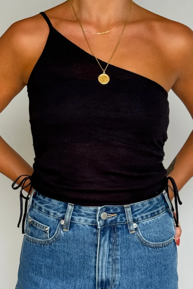 The One Shoulder Knit Crop Top – Black features drawcord channels at the side seams, offering an adjustable ruched effect that adds both dimension and style to the design. Designed with a chic one-shoulder strap, this top is perfect for casual wear.