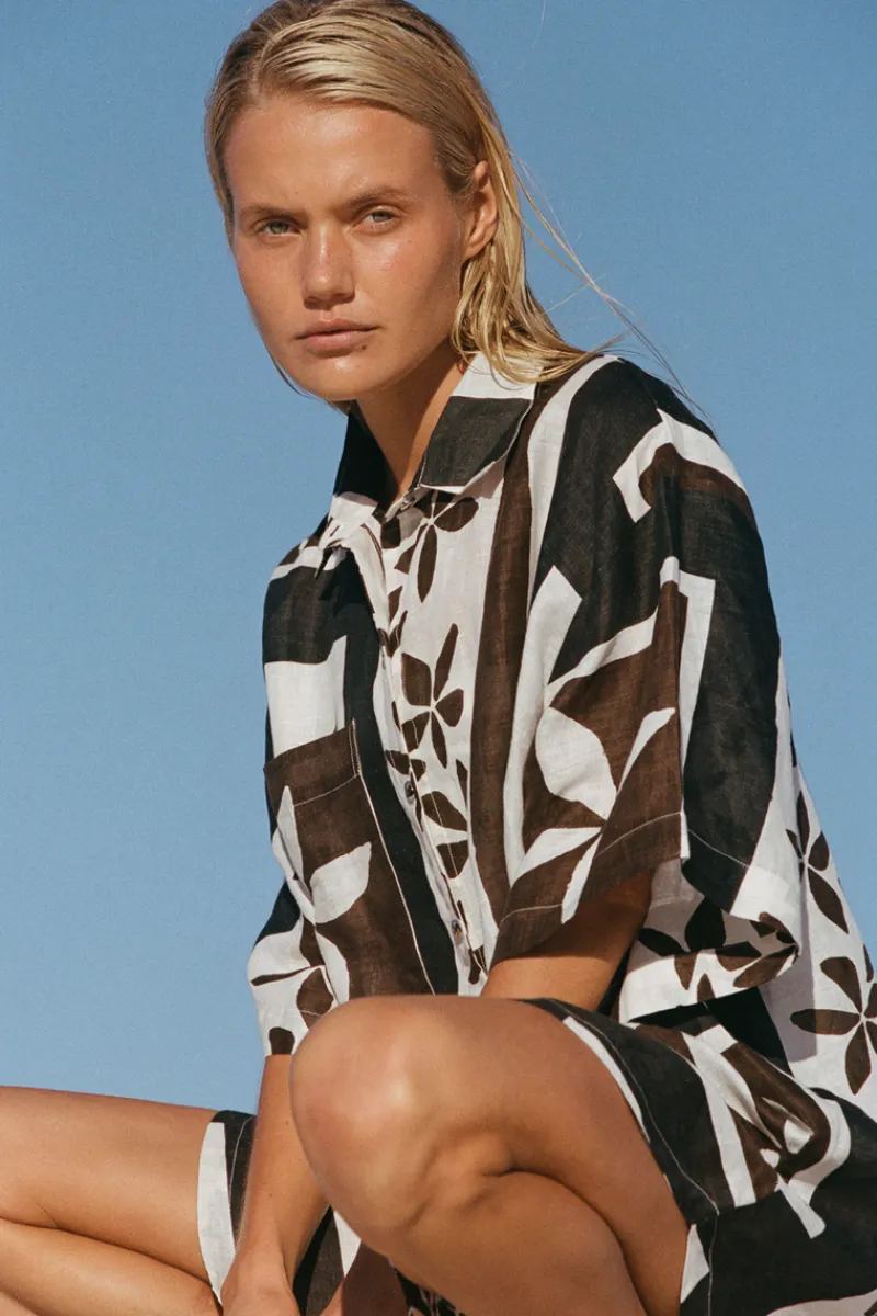 The Sarong Flower Linen Shirt by Zulu & Zephyr, adorned with a unique hand-painted floral print – an ode to wood-panelled interiors, the classic turnback collar shirt features organically shaped metal buttons in a comfortable, relaxed boxy fit. Style with the Sarong Flower Linen Pant for a Resortwear look.