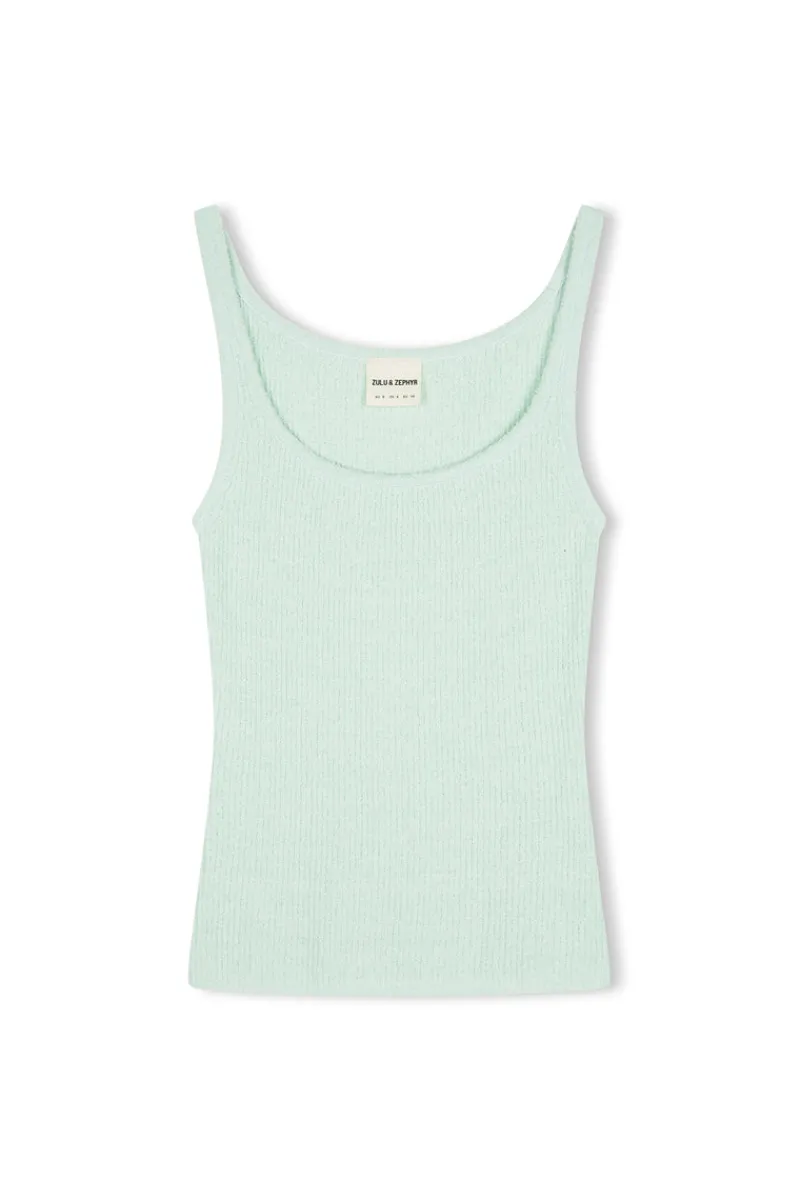 The Seaglass Rib Knit Tank by Zulu & Zephyr showcases a textured rib knit fabric with a stylish square neckline and comfortable wide straps. Crafted in a warm seaglass green, this top is the perfect piece to complement any outfit.
