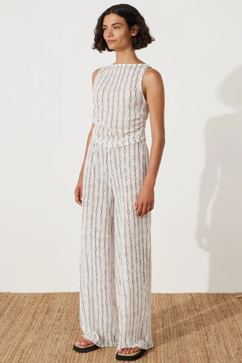The Shell Rouched Knit Top by Zulu & Zephyr showcases a hand-drawn shell print, embodying the serene charm of coastal living. Thoughtful details such as rouched side seams and an asymmetric neckline in a soft, ultra-lightweight sheer knit offer comfort and thoughtful design details. Style alongside the Shell Knit Pant for a coordinated look.