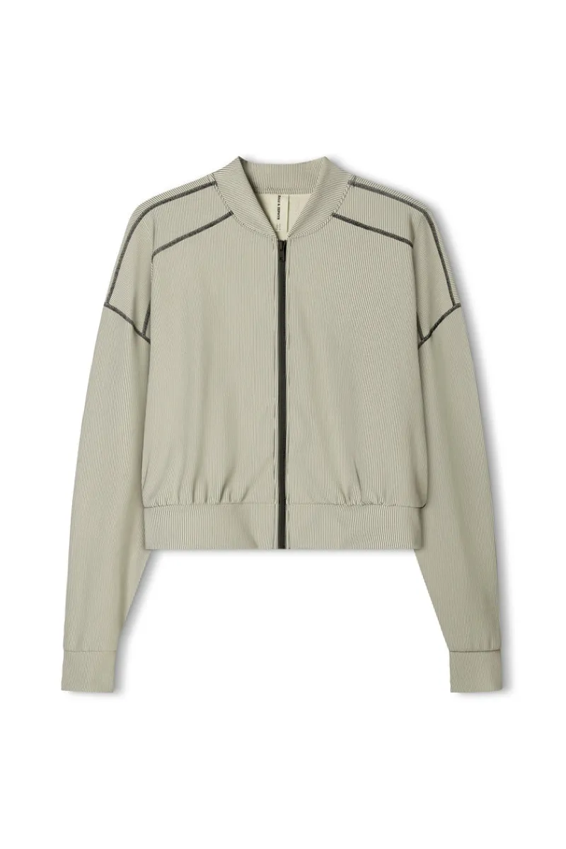 The Stripe Rib Jacket – Coconut by Zulu & Zephyr features a two-tone rib fabrication, drop shoulder, cuff detail and contrast centre zip. The classic bomber silhouette is designed for high-endurance activity, or simply as luxury everyday athleisure wear. Ready to wear with Rib Short or Legging.