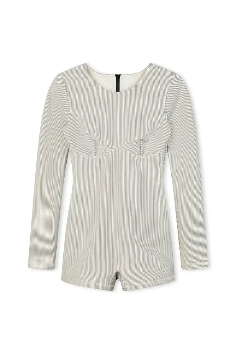 The Stripe Rib Long Sleeve One Piece is designed for sleek, everyday movement. Crafted with a high neckline and zip back entry, this surf suit offers both style and versatility. Featuring an internal shelf bra with piping for subtle support and a flattering fit, it’s perfect for surfing, swimming, or staying comfortably covered.