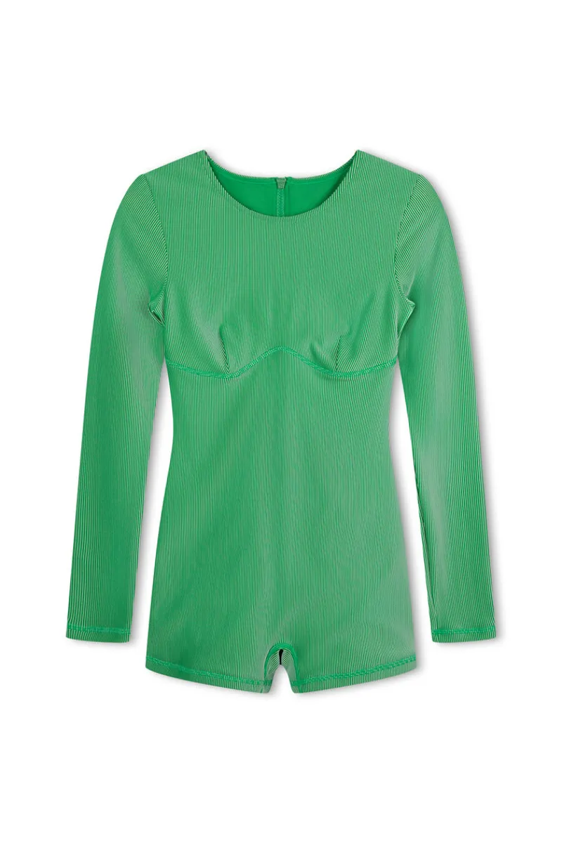 The Stripe Rib Long Sleeve One Piece is designed for sleek, everyday movement. Crafted with a high neckline and zip back entry, this surf suit offers both style and versatility. Featuring an internal shelf bra with piping for subtle support and a flattering fit, it’s perfect for surfing, swimming, or staying comfortably covered.