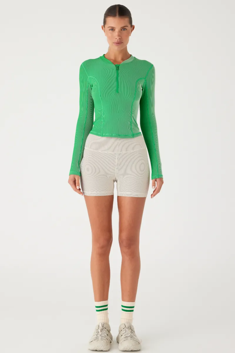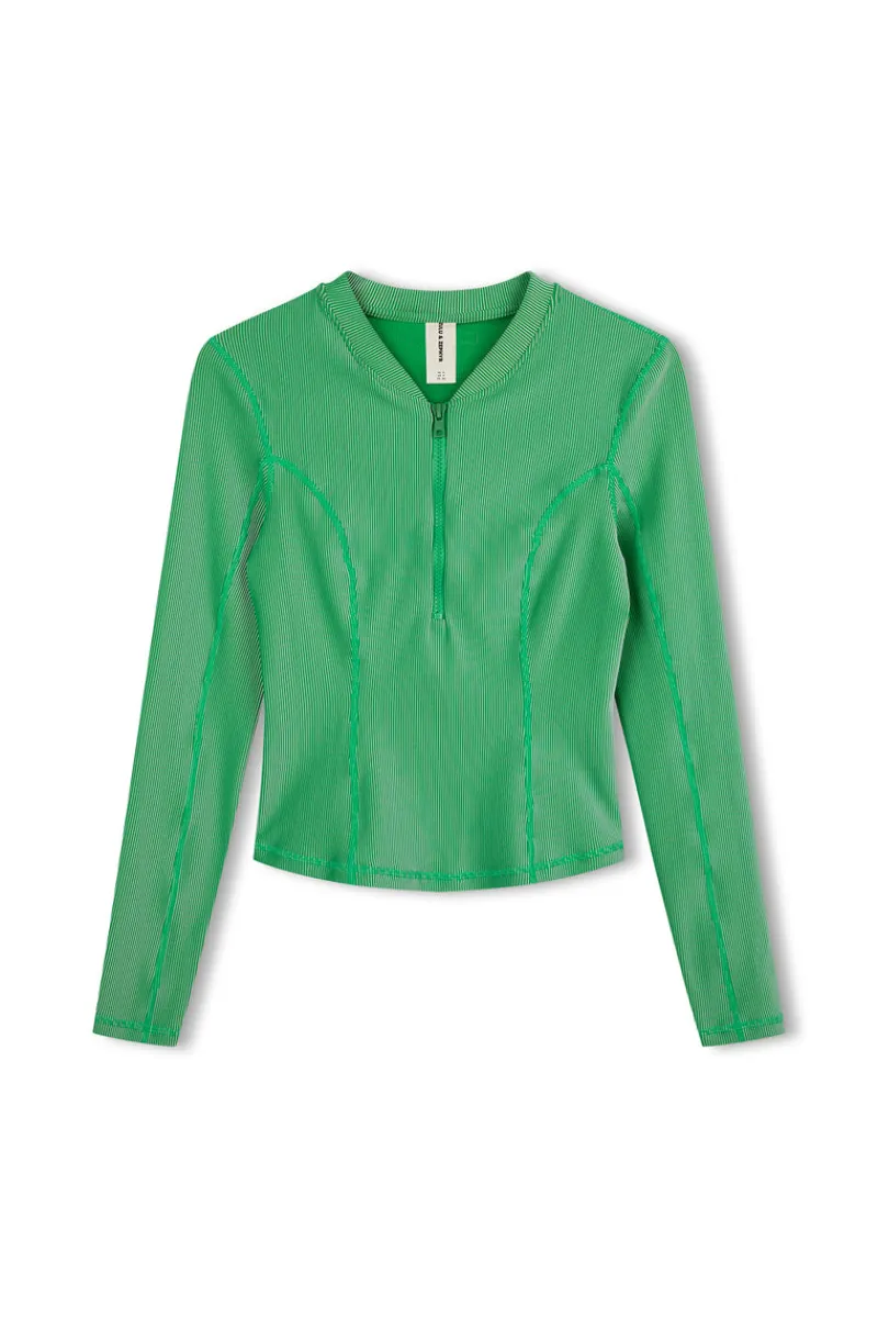 The Stripe Rib Long Sleeve Rash Guard combines functional design with a stylish, streamlined look. Made from ribbed fabric with bold vertical stripes, this rash guard offers excellent sun protection and coverage with its high neckline, front zip and long sleeves. This slim-fitting rashie is crafted to hug the body, offering a close, streamlined fit that moves with you – designed for surfing, swimming, or staying covered on active beach days.