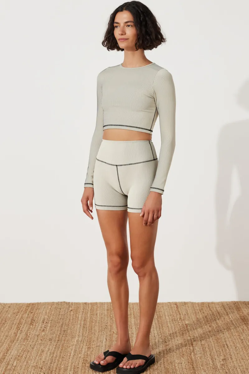 The Stripe Rib Top – Coconut by Zulu & Zephyr features a scoop neckline, with long sleeves in a cropped style. The two-tone, contrast stitch ribbed crop is designed for high-endurance activity, water sports, or simply as luxury everyday athleisure wear, and forms part of the new ZZ Sport range. Pair yours with the Rib Short to wear this functional piece from pilates to lunch.