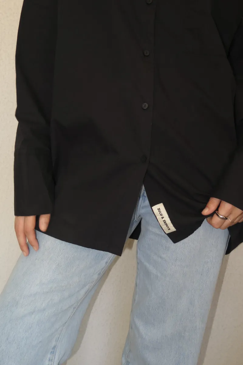 The Classic Shirt – Black by Zulu & Zephyr features a traditional shirt collar and long sleeves with cuff details. Designed with a relaxed, oversized fit, this shirt is made from a soft, lightweight fabric and finished with branded corozo buttons down the centre. Perfect for pairing with denim for an everyday look.