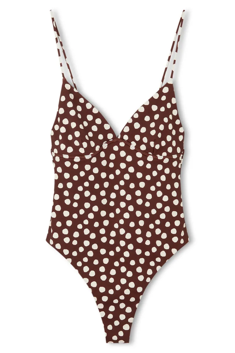 The Currant Spot One Piece by Zulu & Zephyr features a low scoop back, high cut leg, and a soft bust without underwire in a custom hand-painted print. The adjustable thin shoulder straps feed through to the back, where they may be tied to suit, offering an optimum fit.