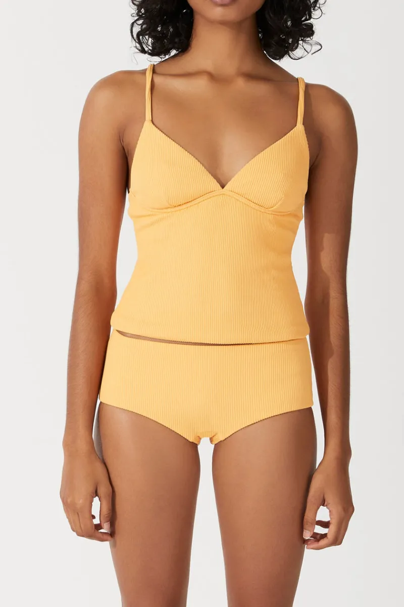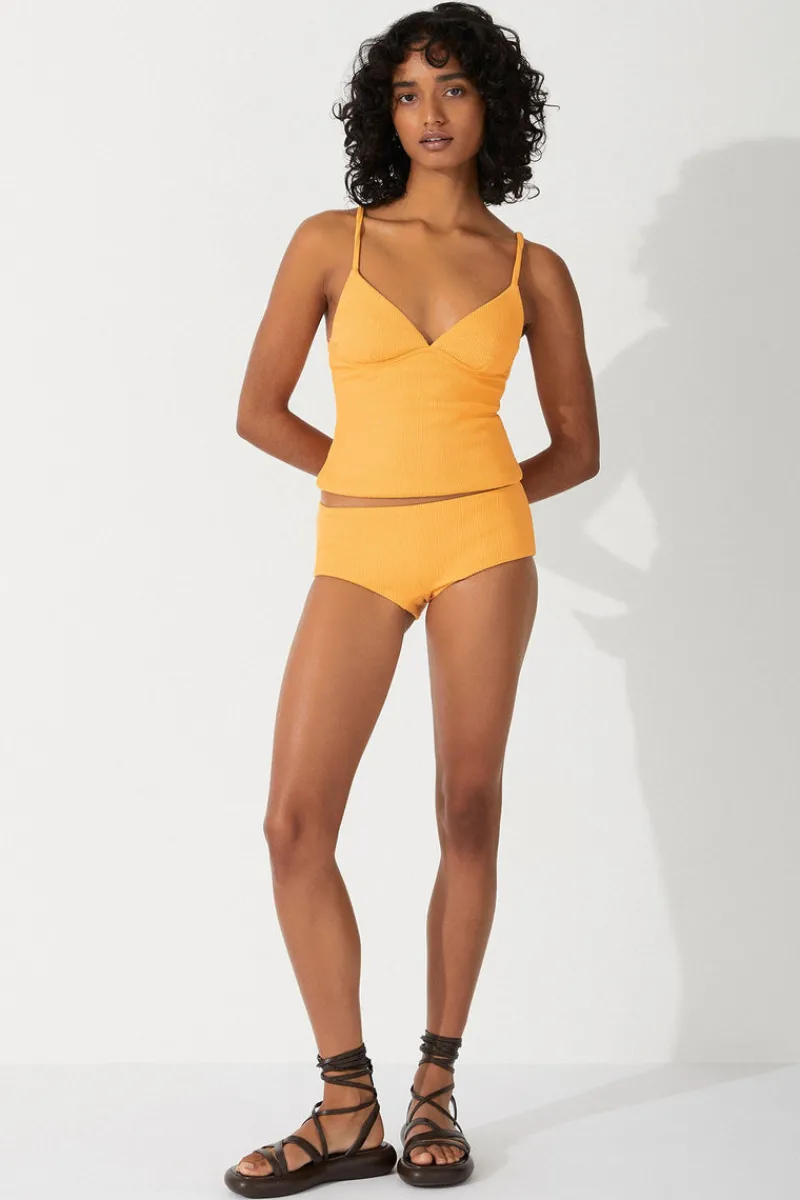 The Mandarin Rib Hipster Brief by Zulu & Zephyr is a mid-rise shape, with wide sides and cheeky boyleg coverage, in a vibrant, fruity, textured spongey rib. Wear it with the Mandarin Rib Tankini Top for a coordinated set.