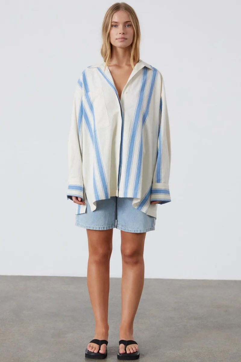 The Marine Stripe Organic Cotton Blend Shirt by Zulu & Zephyr features a custom blue stripe on a classic cream base. Designed with a traditional cuff and concealed placket, this timeless shirt offers a refined yet casual look. Perfect for layering over swimwear or pairing with denim, it’s a versatile staple for any wardrobe. Style with Marine Stripe Organic Cotton Blend Mini Skirt for a coordinated look.