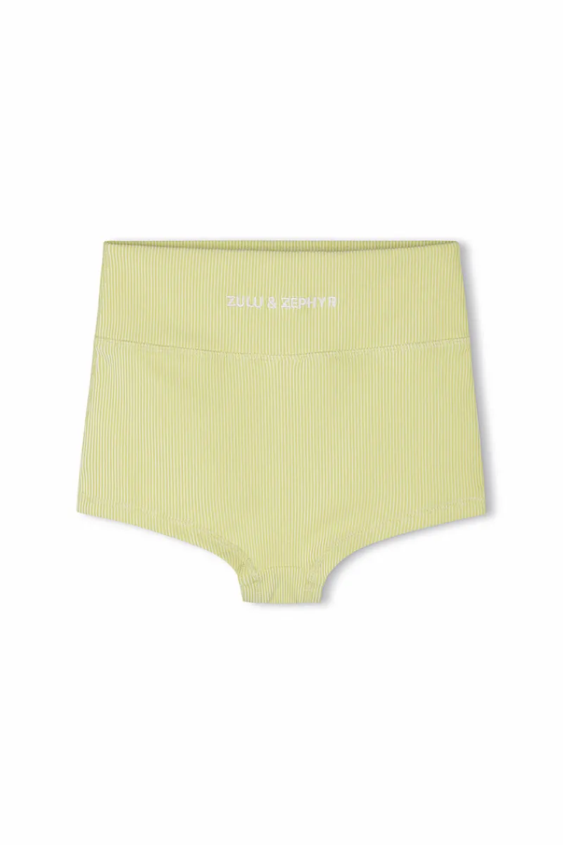 The Mini Stripe Rib Boy Short – Citrus by Zulu & Zephyr is a kid-friendly version of the popular women’s Boy Short, designed for a perfect fit for your little one. Featuring a high-waist, modest coverage at the legs and bum, and the signature Zulu & Zephyr logo on the lower back. This ribbed style is easy to pair with a matching Mini swim top, rashie, or one-piece for a complete look. Ideal for fun in the sun!