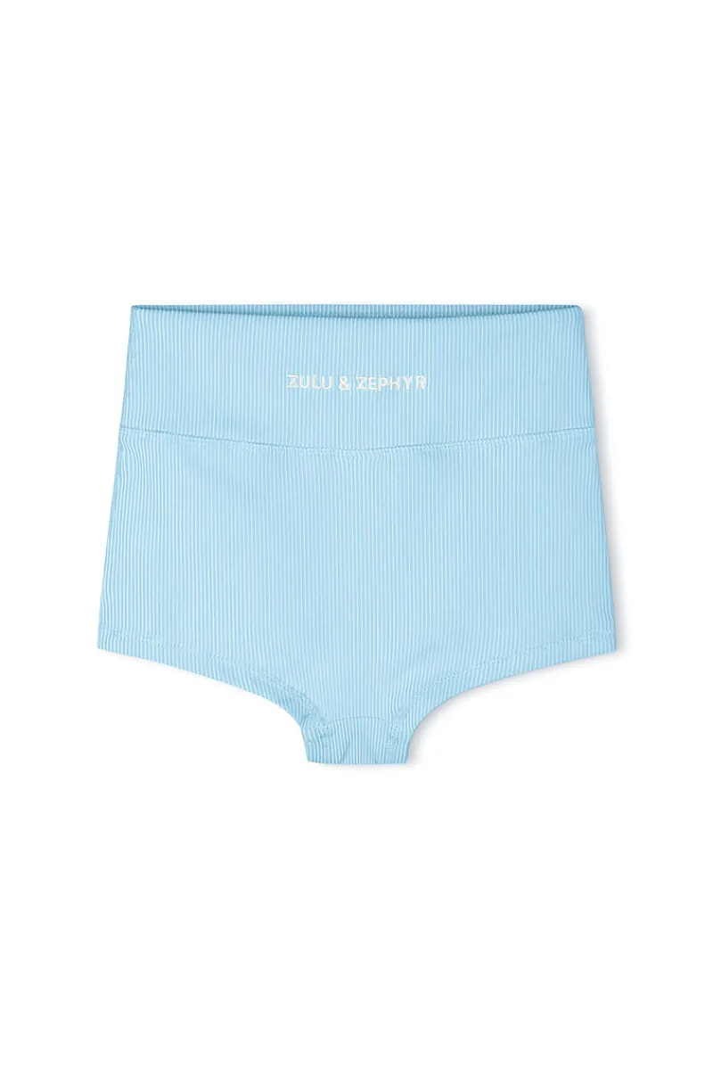 The Mini Stripe Rib Boy Short by Zulu & Zephyr is a kid-friendly version of the popular women’s Boy Short, designed for a perfect fit for your little one. Featuring a high-waist, modest coverage at the legs and bum, and the signature Zulu & Zephyr logo on the lower back. This ribbed style is easy to pair with a matching Mini swim top, rashie, or one-piece for a complete look. Ideal for fun in the sun!