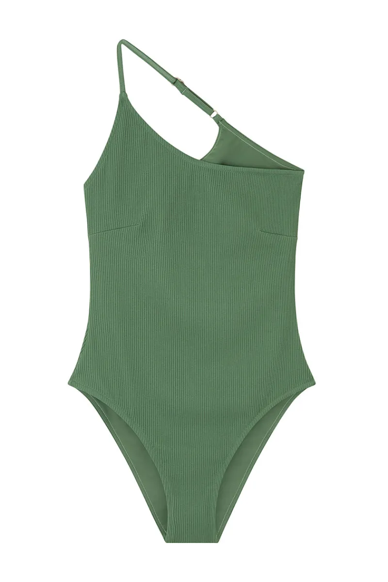 The Myrtle Rib Asymmetric One Piece by Zulu & Zephyr is a clean one-shouldered shape, with a comfortable soft unpadded bust and adjustable shoulder strap, in a mossy green premium spongey rib. Wear under the sheer Olive Lattice Knit Dress with its complementing neckline.