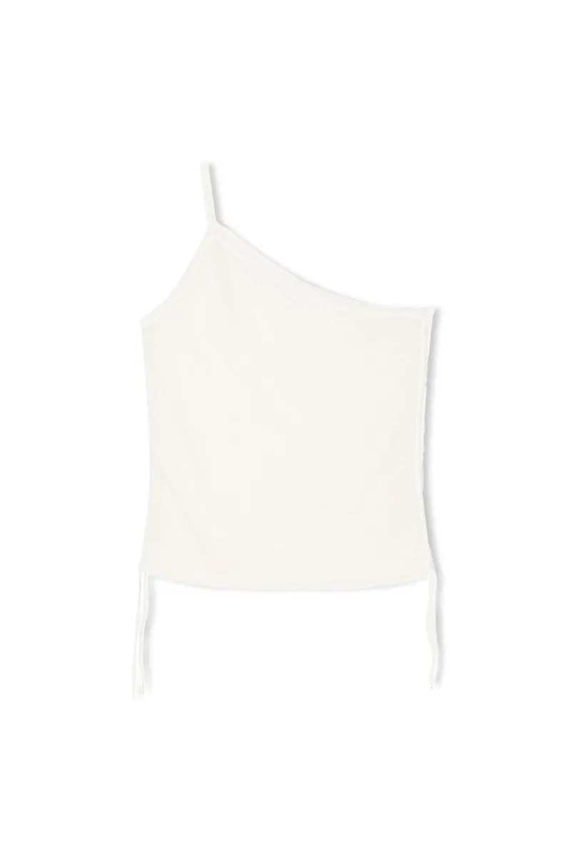 The One Shoulder Knit Crop Top – White features drawcord channels at the side seams, offering an adjustable ruched effect that adds both dimension and style to the design. Designed with a chic one-shoulder strap, this top is perfect for casual wear.