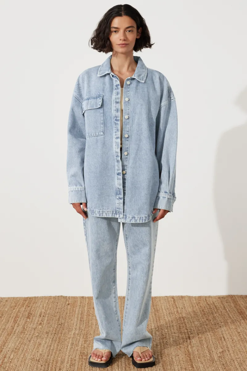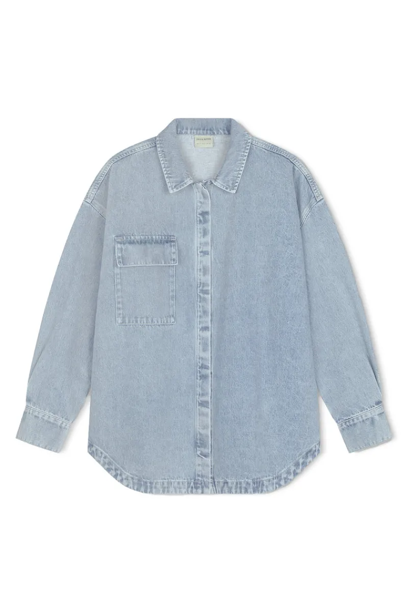 The Recycled Cotton Jacket – Light Wash by Zulu & Zephyr features a generous, oversized fit with drop shoulders, in a classic light wash denim. This durable piece has a front patch pocket, concealed placket, and button closure cuff. Pair this wardrobe staple with our Recycled Cotton Mid Rise Jean – Light Wash for a matching set.
