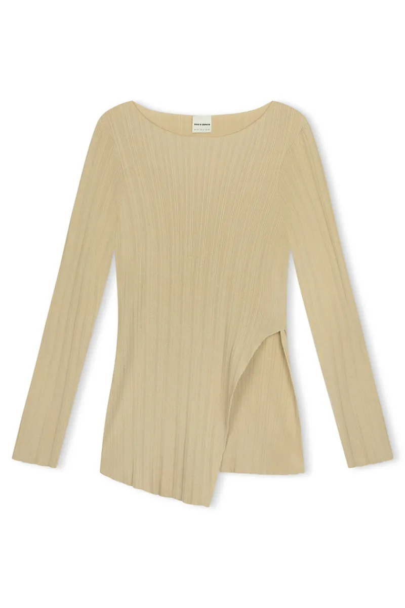 The Sand Rib Knit Top by Zulu & Zephyr features a soft rib knit fabric with an asymmetric split hem, complemented by a classic high-relaxed neckline. Crafted in a neutral sand colorway, layer over the Sand Rib Knit Skirt for a styled look.