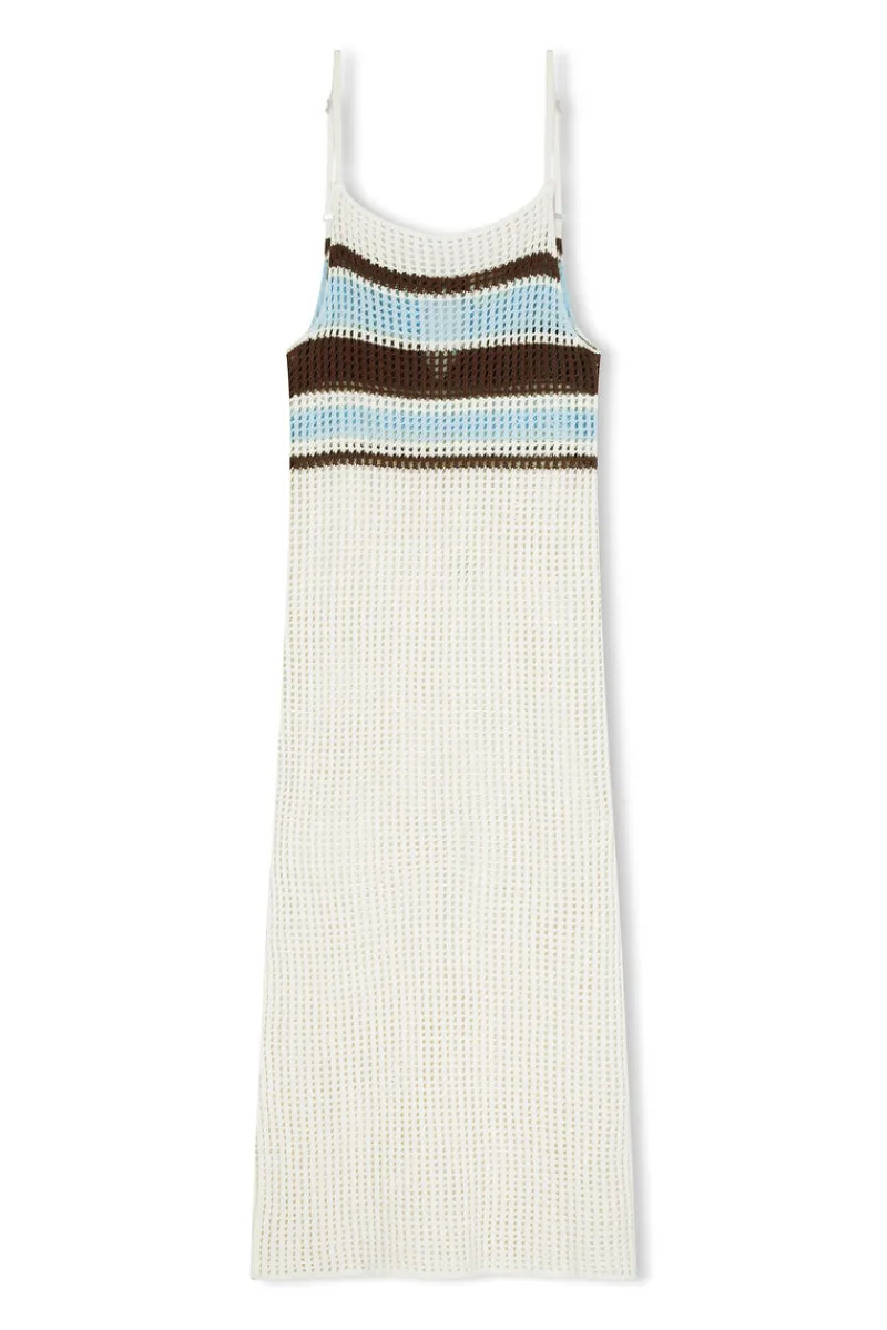 The Sea Stripe Cotton Crochet Dress by Zulu & Zephyr features a custom sky blue and chocolate brown stripe in a mid-length style. With slim adjustable straps and side splits that reach mid-thigh, pair with the Sea Stripe Cotton Crochet Skirt for a layered look or wear over swim.