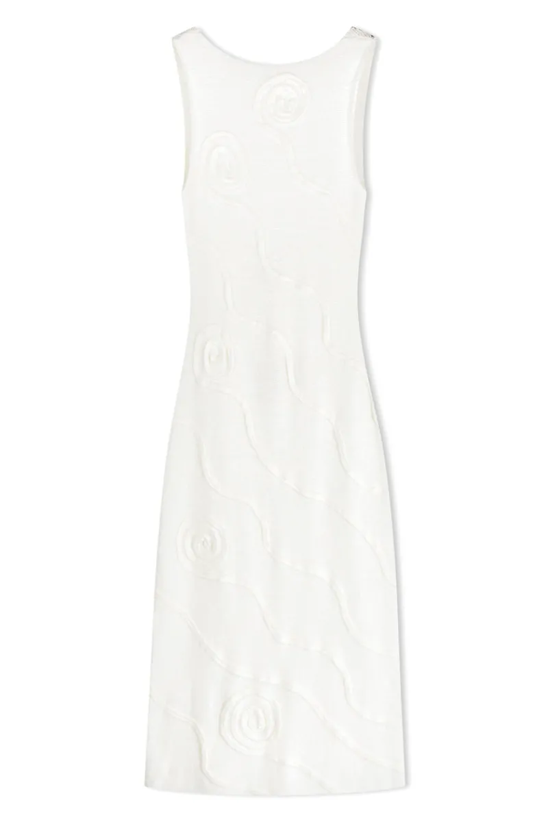 The Shea Organic Cotton Swirl Knit Dress is crafted from a soft mid-weight blend of cotton and nylon, offering a comfortable yet elevated feel. Featuring a striking jacquard swirl pattern, this dress has a high neckline at the front that contrasts with its alluring low-back design. The relaxed silhouette makes it perfect for easy, elegant resortwear styling.