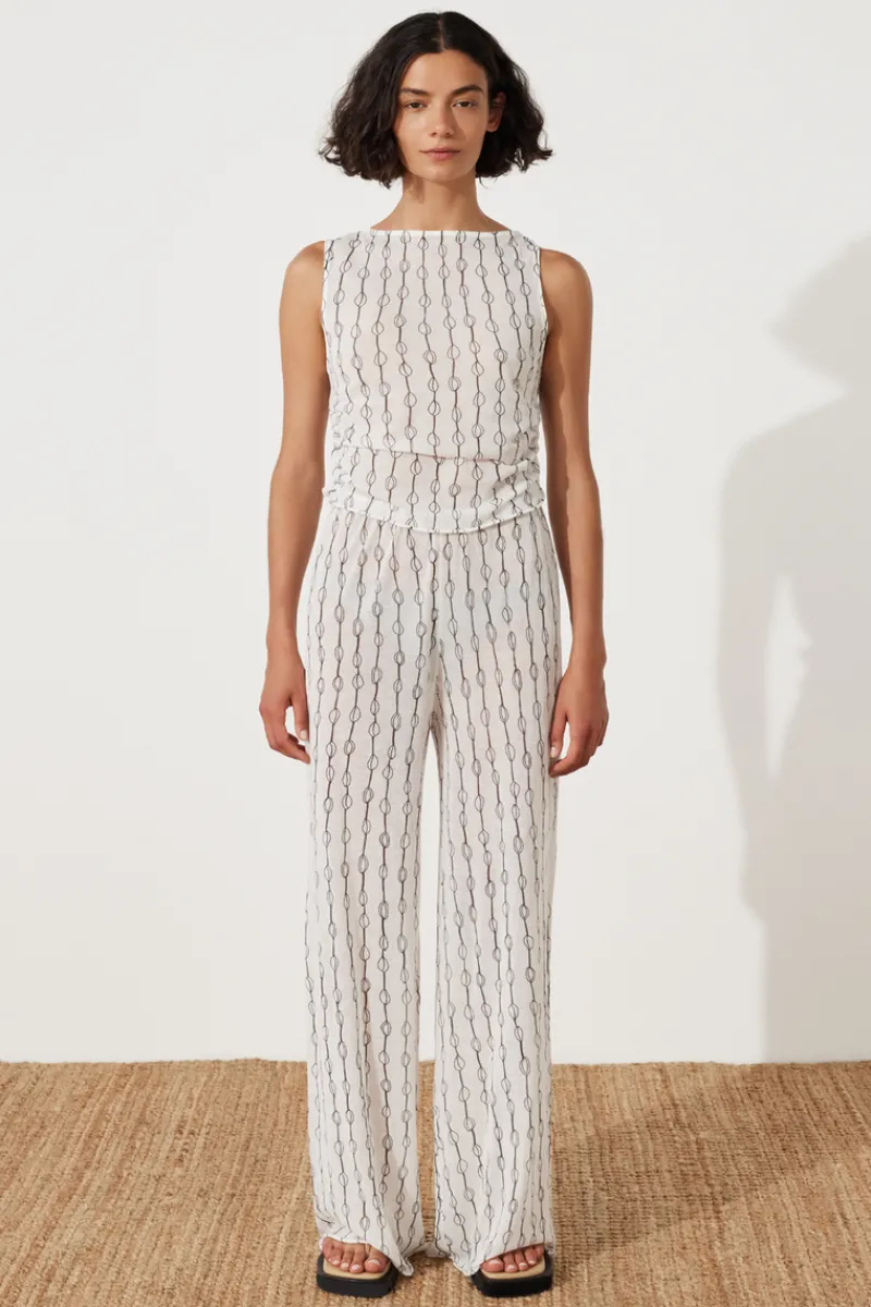The Shell Knit Pant by Zulu & Zephyr features a hand-drawn shell print that captures the tranquil essence of coastal living. With a soft elastic, slim waistband and relaxed full-length leg, these ultra-lightweight, delicate sheer knit pants offer comfort and thoughtful design details, perfect for beach days or occasion evenings. Style alongside the Shell Rouched Knit Top for a coordinated look.