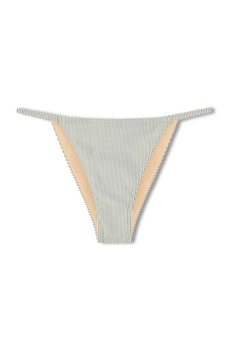 The Signature Stripe Hipster String Brief – Coconut this style features a chic low-rise silhouette with fixed string sides, providing minimal coverage ideal for sunbathing. For a more contoured look, you can effortlessly adjust the fit to sit higher on the hips. The luxurious two-tone ribbed fabric introduces a touch of refinement to the Signature swim collection.