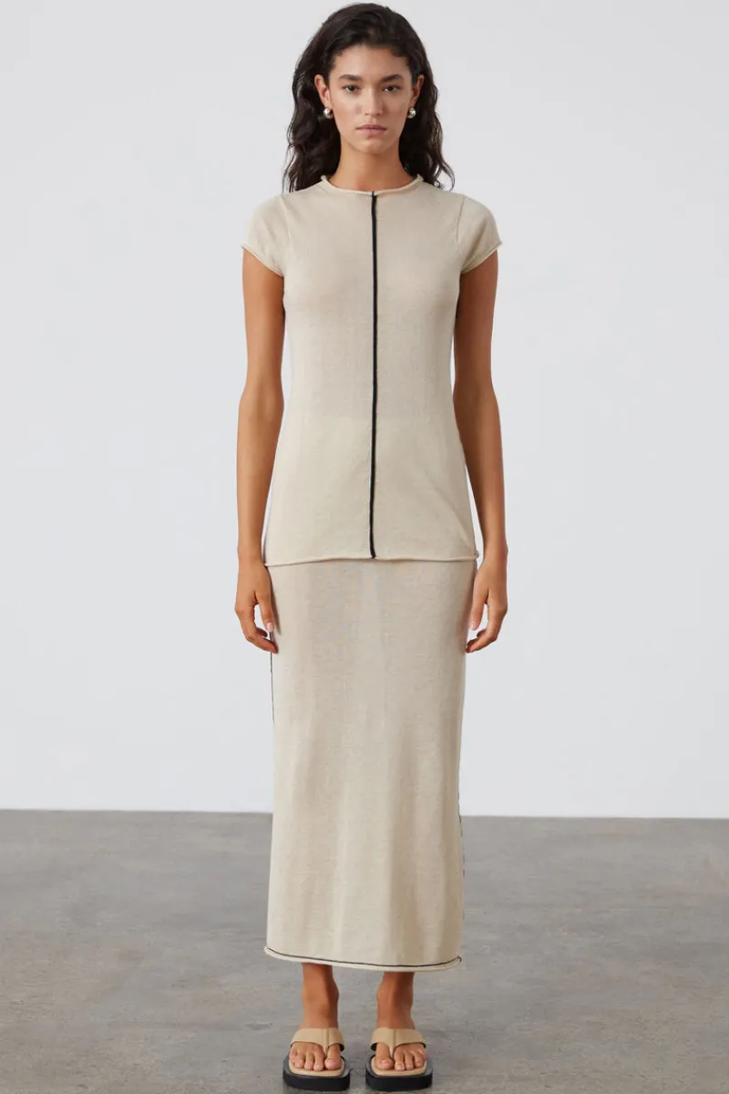 The Stone Contrast Cotton Blend Knit Top is crafted from soft sheer knit fabric for a lightweight, breathable feel. Featuring a high neckline and cap sleeves, it blends modern and classic styling. The contrast centre back seam adds a subtle design element, making this top a versatile choice for both casual and elevated looks.